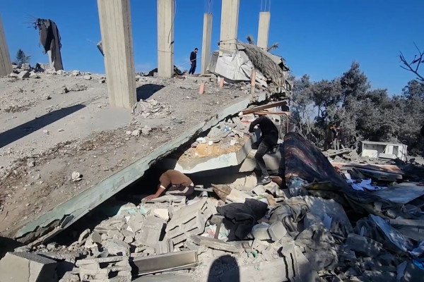 [Image: gedung universitas yang rusak akibat serangan udara di Teheran]